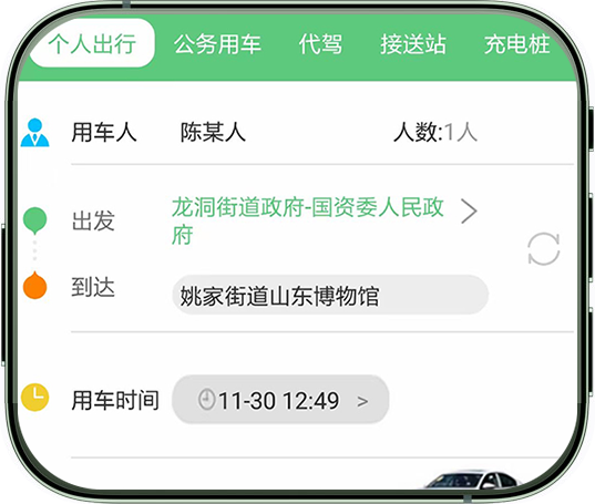 The car user fills in the car order on the applet and app, including who uses the car, their contact information, car start time, car end time, starting point, destination, who uses the car, the number of people on this trip and the type of car applied for.
